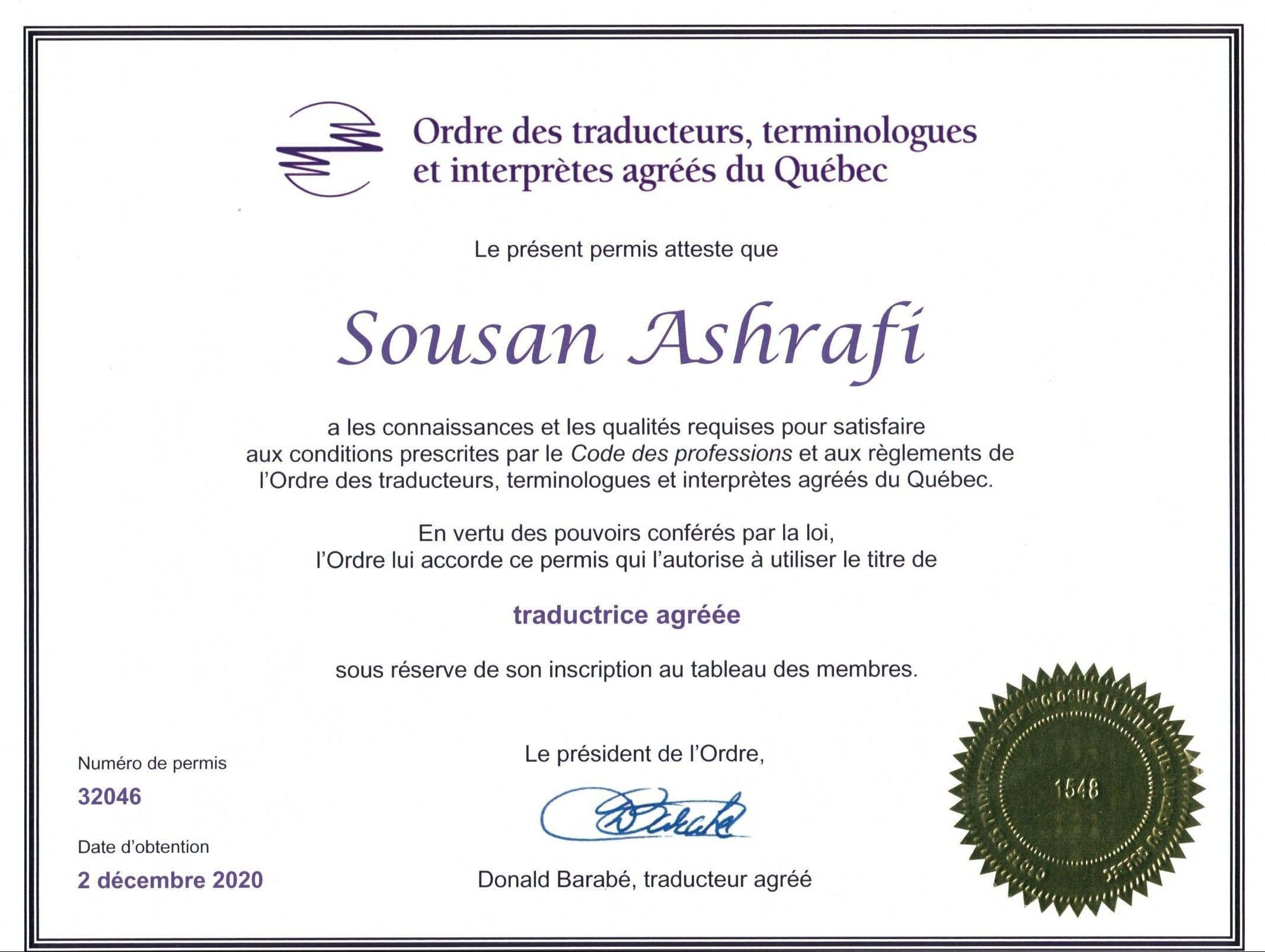 دفتر ترجمه رسمی اشرفی با مدیریت خانم سوسن اشرفی دارنده ی مجوز رسمی از انجمن مترجمان رسمی کبک از سال 2020 مفتخر به ارائه خدمات ترجمه رسمی و غير رسمی با بالاترین کیفیت و با رعايت اصول مشتری مداری به هموطنان عزیز ساکن کانادا می باشد.